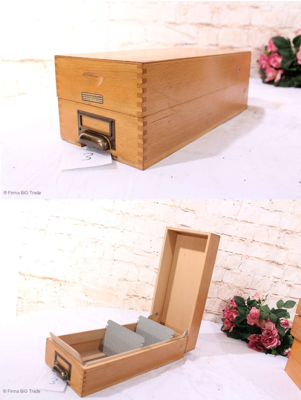 RETRO! Schöner alter Karteikasten Kartei Register Holzkarteikasten Metallgriff Schild / Nr. 3