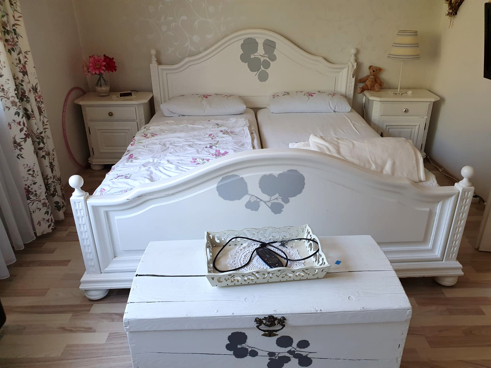 7tlg. Landhaus Schlafzimmer / Bauernzimmer Ehebett m. 2 Lattenroste / 2 Nachttische / Kommode u. Antike Biedermeier Truh