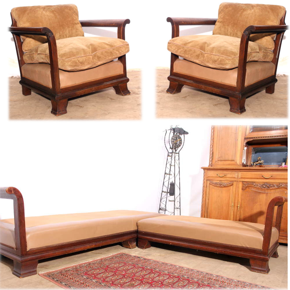 SELTEN! Antike 4tlig. Art Déco Möbelgarnitur 2 Sofas / Liegen Chesalons 2 große Sessel Polstergarnitur Wildleder