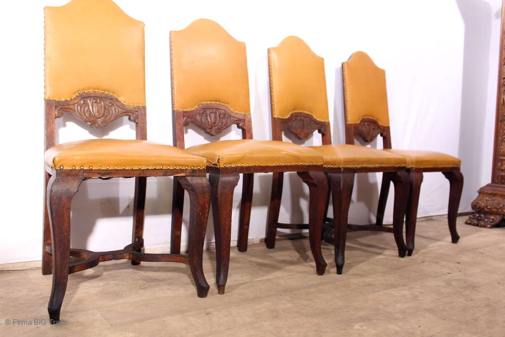 4 antike Jugendstil Hochlehnstühle Lederstühle Ritterstühle Tafelstühle Eiche Massiv Schnitzereien / Nr. 545