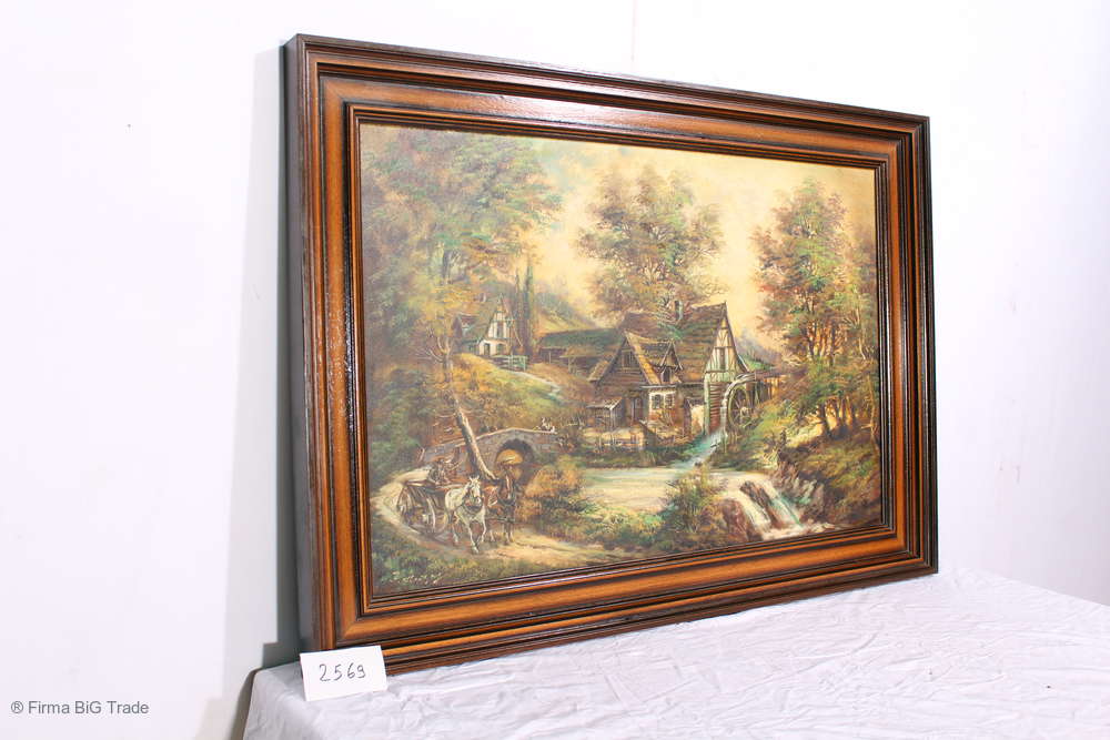 Großes altes Gemälde auf Leinwand Waldmühle Kutscher Pferde Landschaft Signiert Edler Rahmen / Nr. 2569
