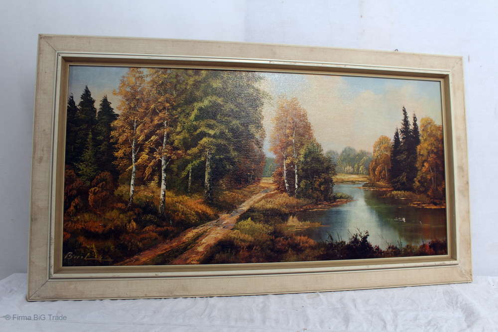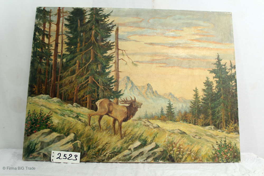 Großes altes Gemälde auf Leinwand Jagd Wald Hirsch / Signiert K. JANN 1963 / Nr. 2523