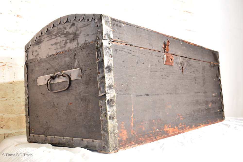Große Antike Jugendstil Reisetruhe Runddeckeltruhe Holztruhe Eisenbeschläge Offizier-Truhe Kutschentruhe