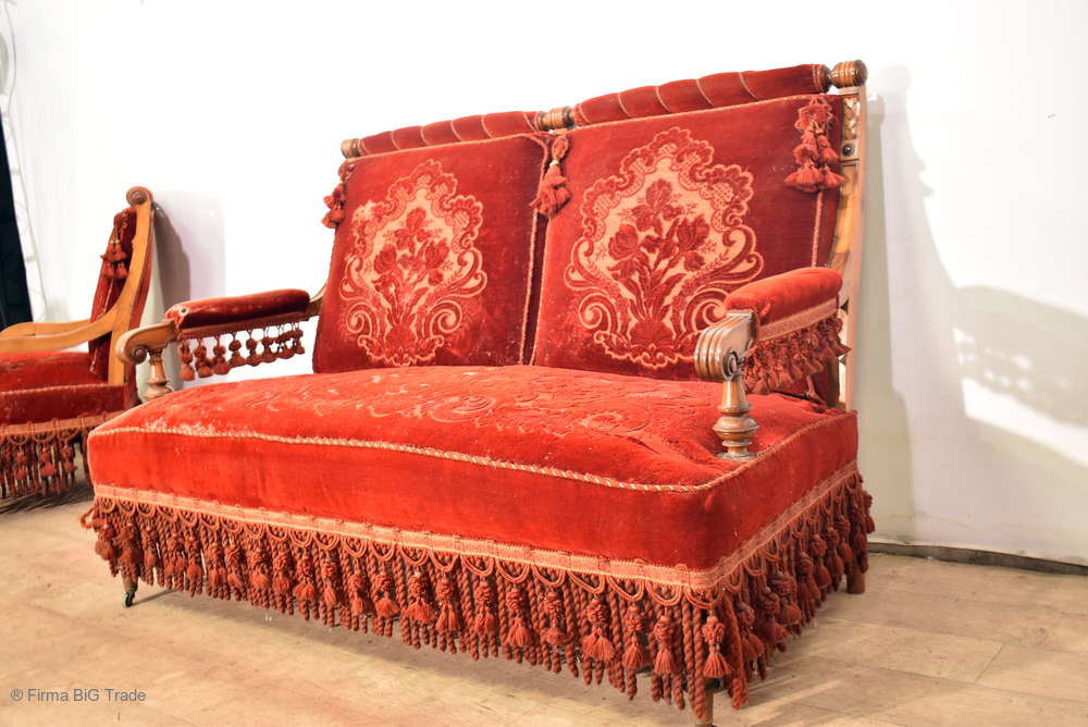 Herrschaftliches Gründerzeit Salon Sofa Couch Polstermöbel Purpurroter Bezug Ornament Stoff zum Aufarbeiten