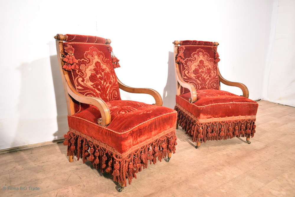 2 Herrschaftliche Gründerzeit Salon Sessel Armlehnstühle Polstermöbel Purpurroter Bezug Ornament Stoff zum Aufarbeiten