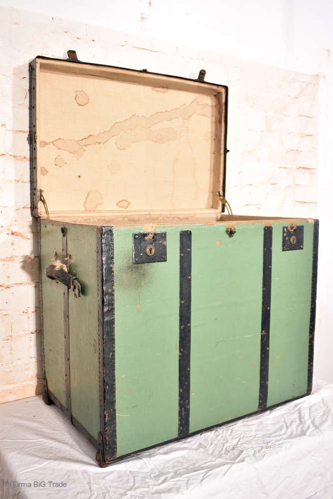 Große antike Überseetruhe / Überseekoffer / Kutschertruhe / Droschkenkoffer / Eisenbänder Eisenbeschläge