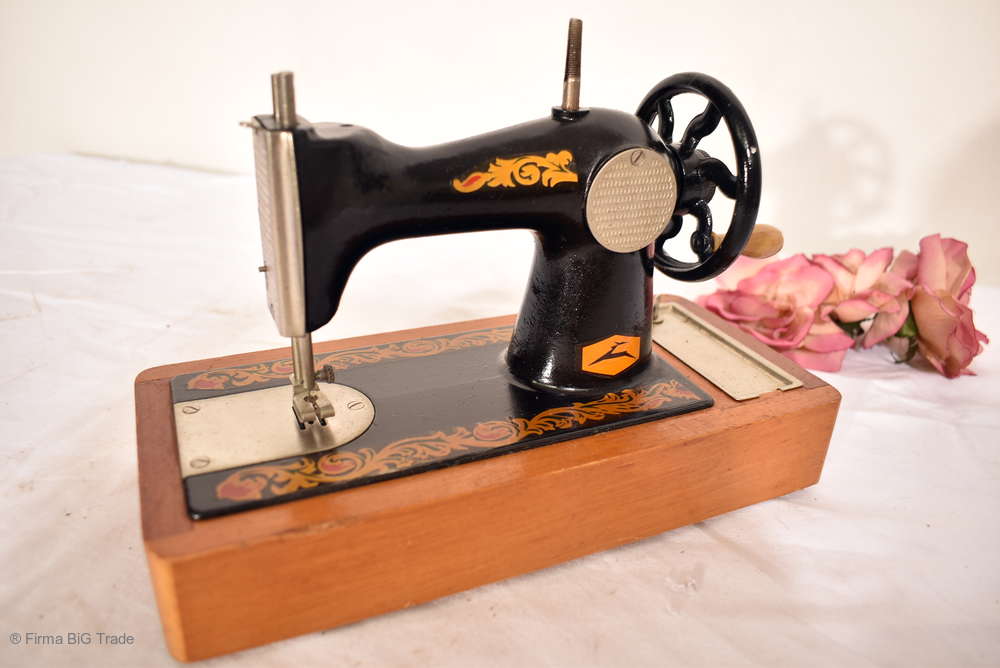 SELTEN! Kleine Tischnähmaschine Miniatur Nähmaschine m. Kurbel Holzkasten u. Metall