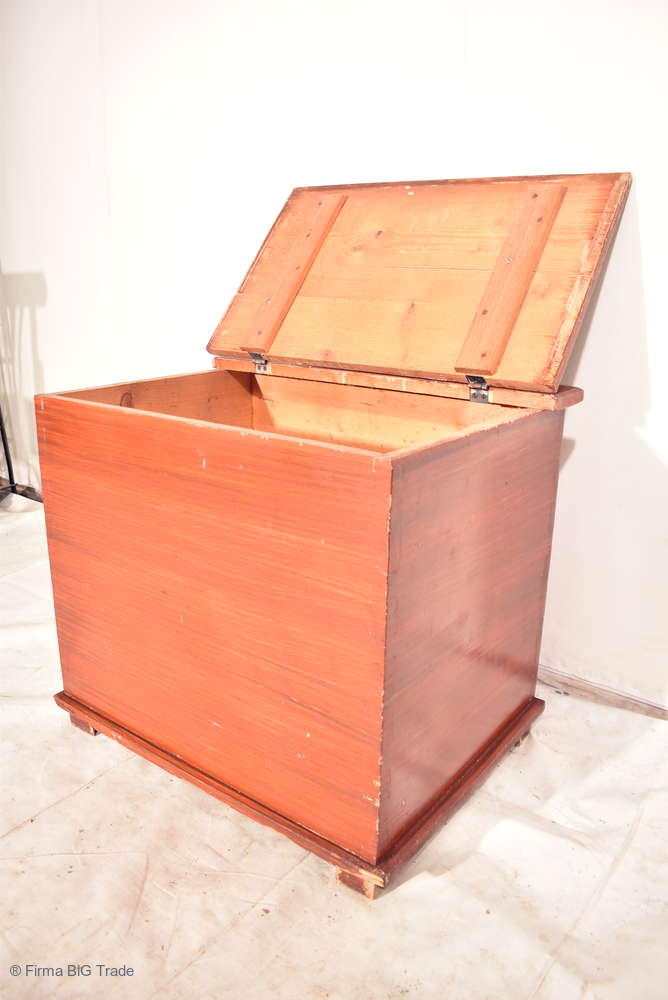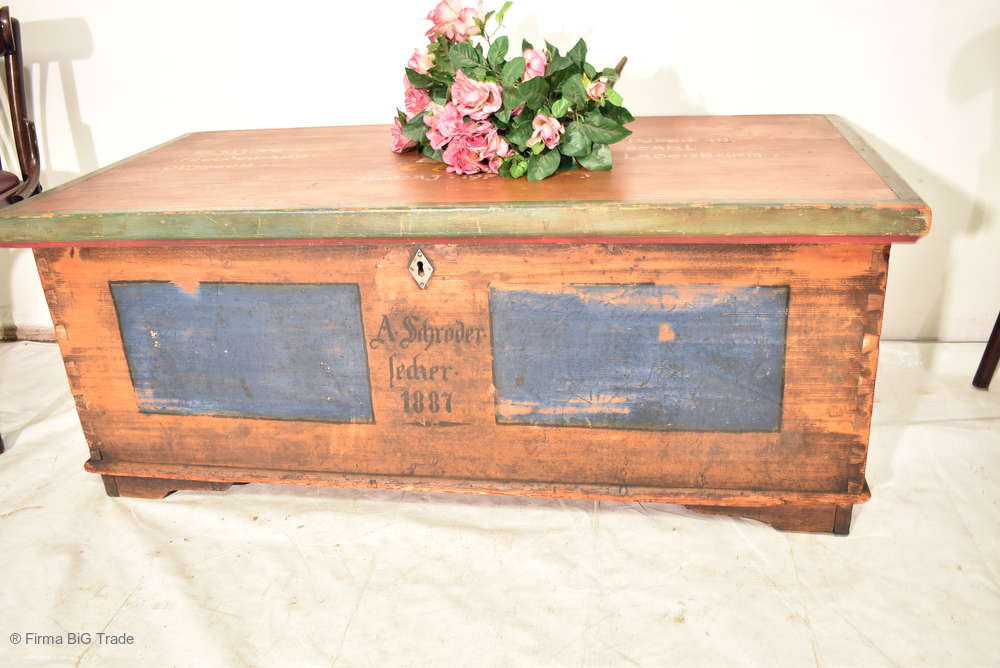 Große antike Flachdeckeltruhe von 1887 Bauerntruhe Landhaus Truhe Holztruhe Wäschetruhe Hochzeitstruhe Innenkasten Massi