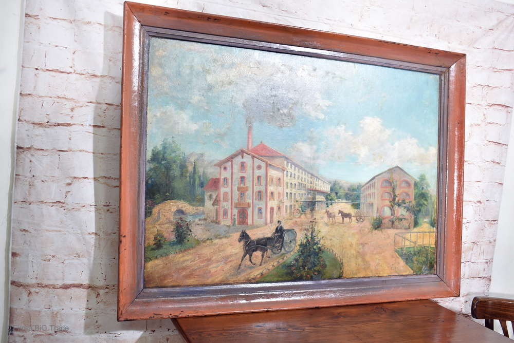 Großes antikes Ölgemälde Stillleben Gemälde signiert Fabrik-Gebäude Kutsche Großer Holzrahmen 133 x 97 cm / Nr. 2543